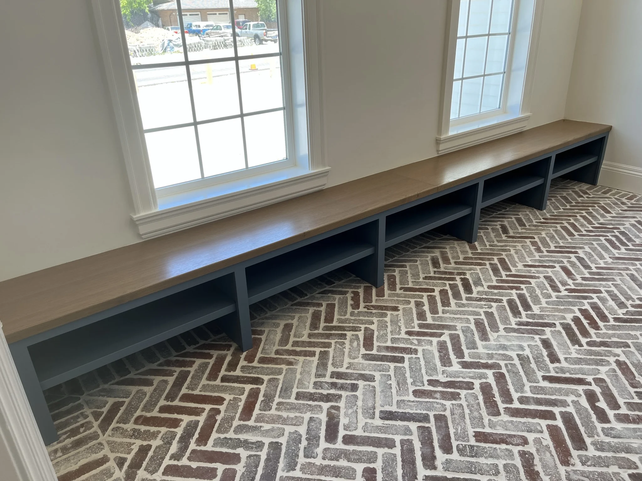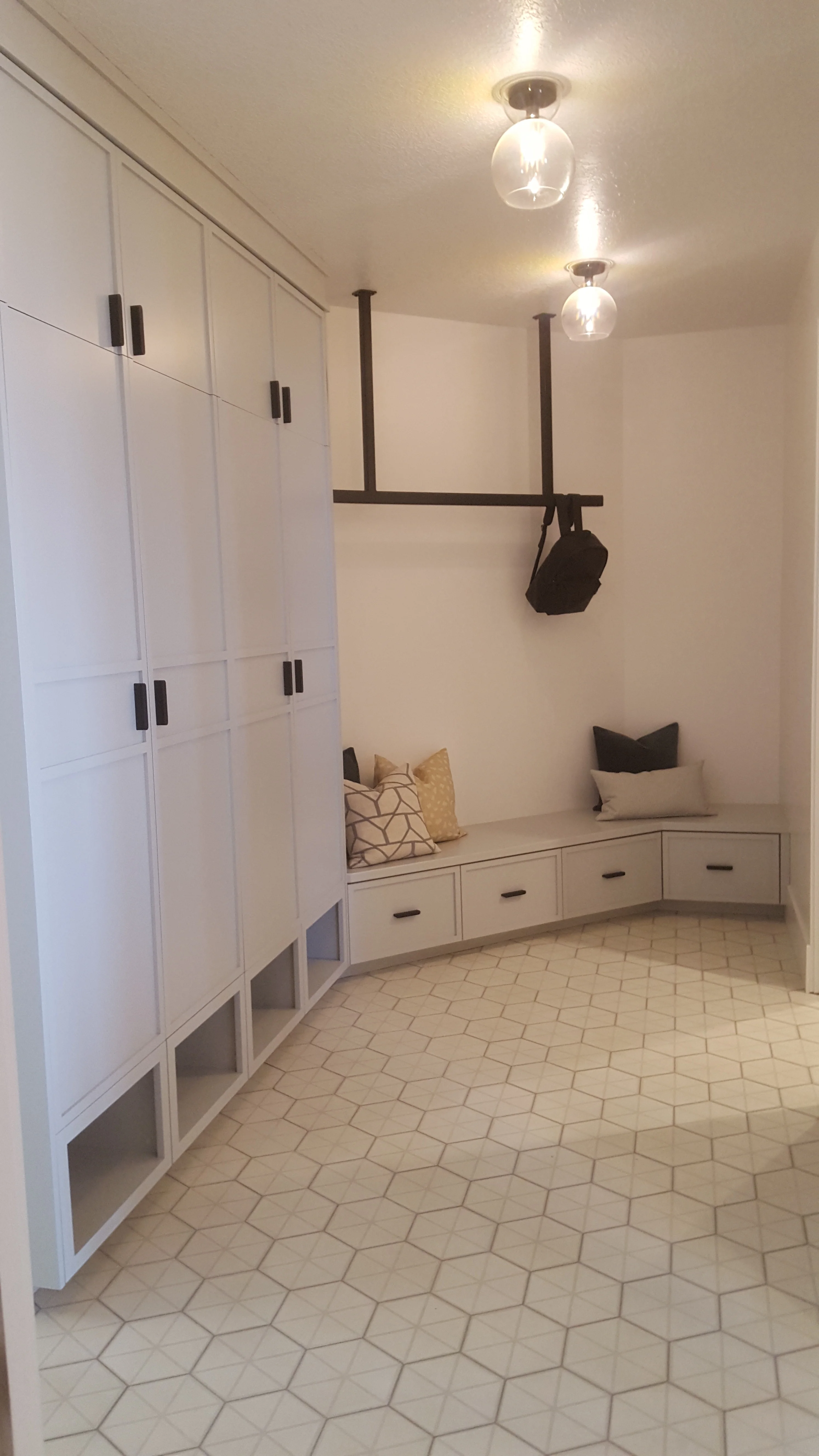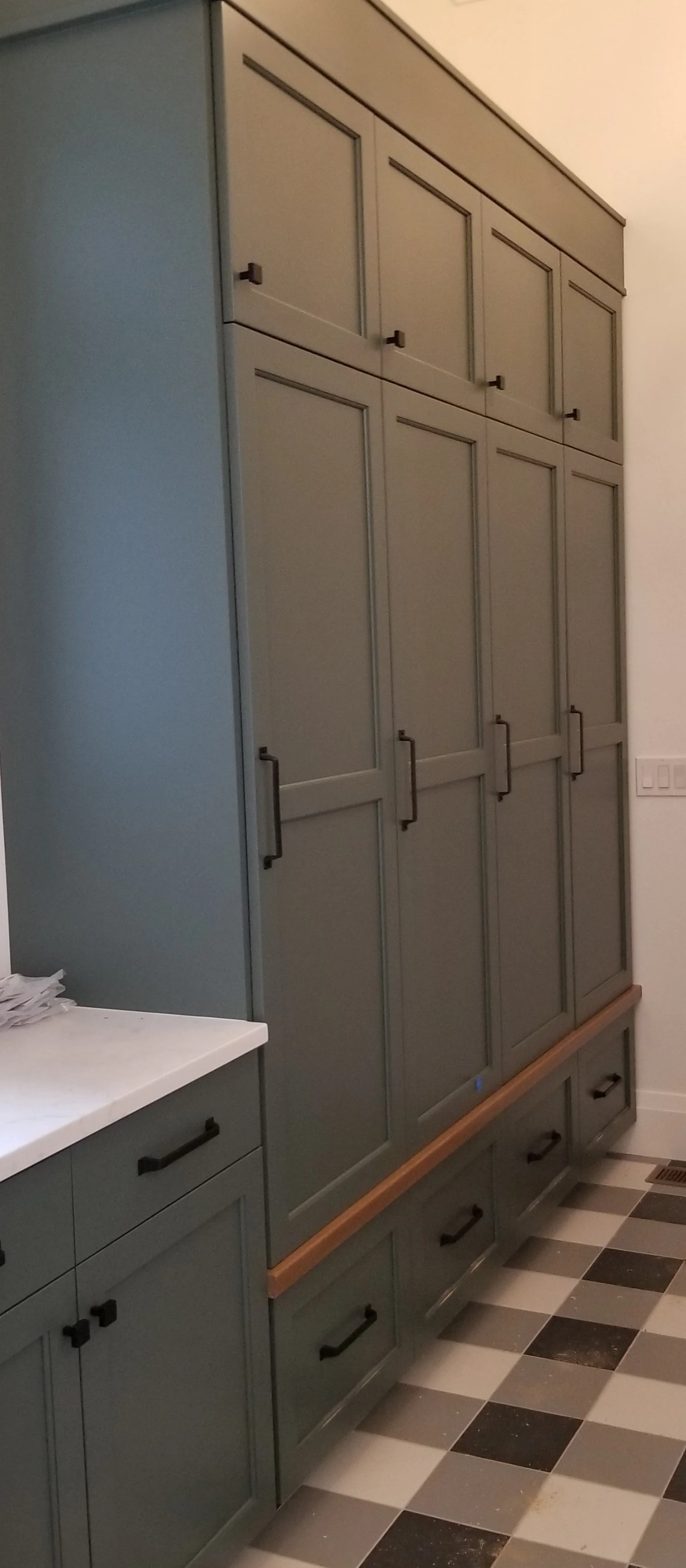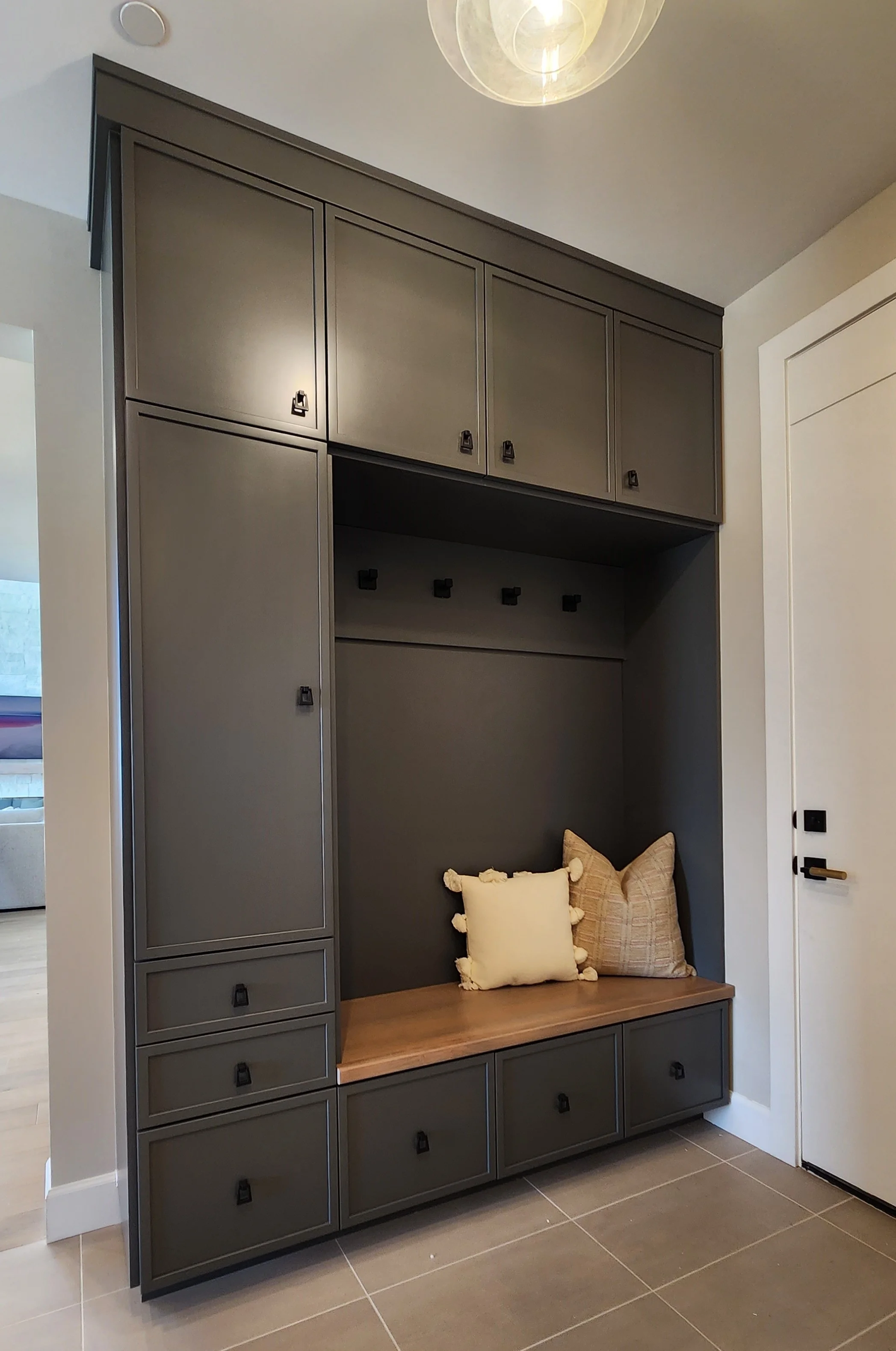 Custom mudroom cabinetry with built-in lockers, benches, and cubbies designed to keep entryways organized and stylish.